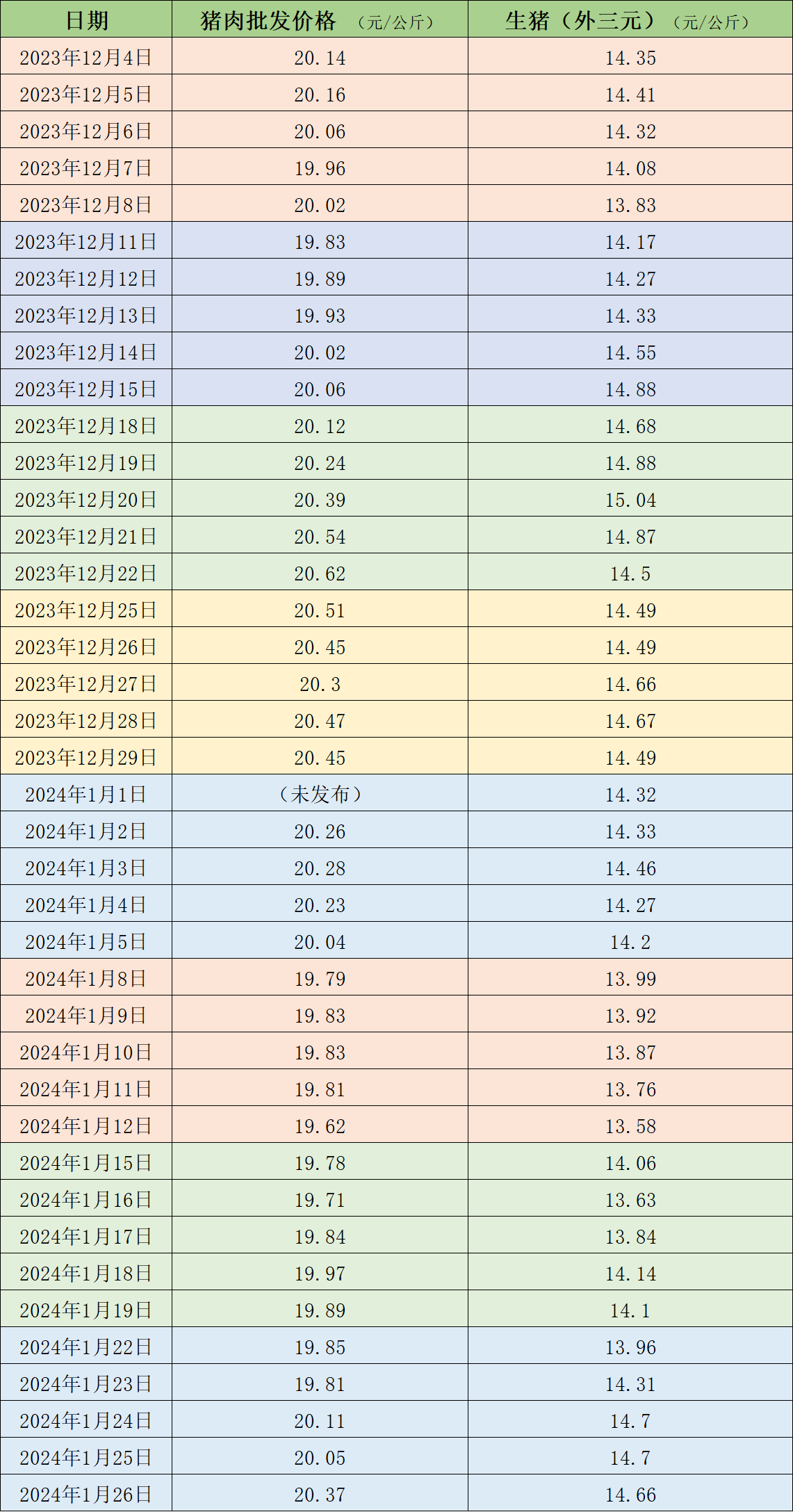 据农业农村部监测,1月26日,全国农产品批发市场猪肉平均价格为20.37元/公斤,与上周五(1月19日)的19.89元/公斤相比,上涨2.4%。本周的平均价格为20.04元/公斤,与上周19.84元/公斤的均价相比,上涨1%。